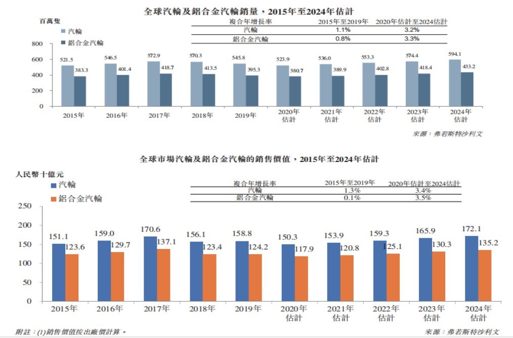 据弗若斯特沙利文报告,全球汽车铝合金汽轮的销量由2015年的3.83亿只增加至2019年的3.95亿只,复合年增长率为0.8%。得益于全球汽车市场的稳定增长,预期2024年销量将达到4.33亿只。全球铝合金汽轮销售价值由2015年的1236亿元增至2019年的1242亿元,复合年增长率为0.1%。预期市场规模将由2020年的1179亿元增至2024年的1352亿元,复合年增长率为3.5%。